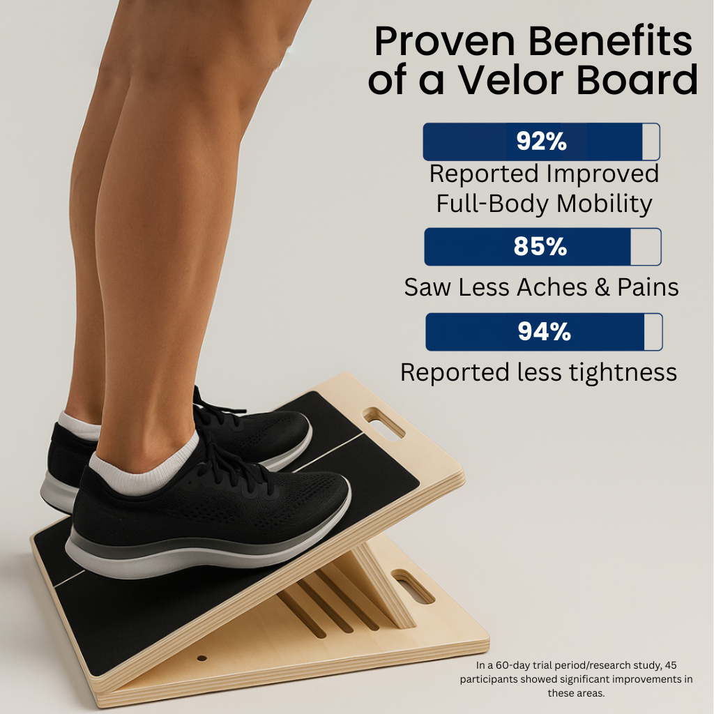 The Velor Board is a simple yet powerful tool designed to improve the way your lower body moves, feels, and functions, starting with your ankles, calves, knees, and hips.